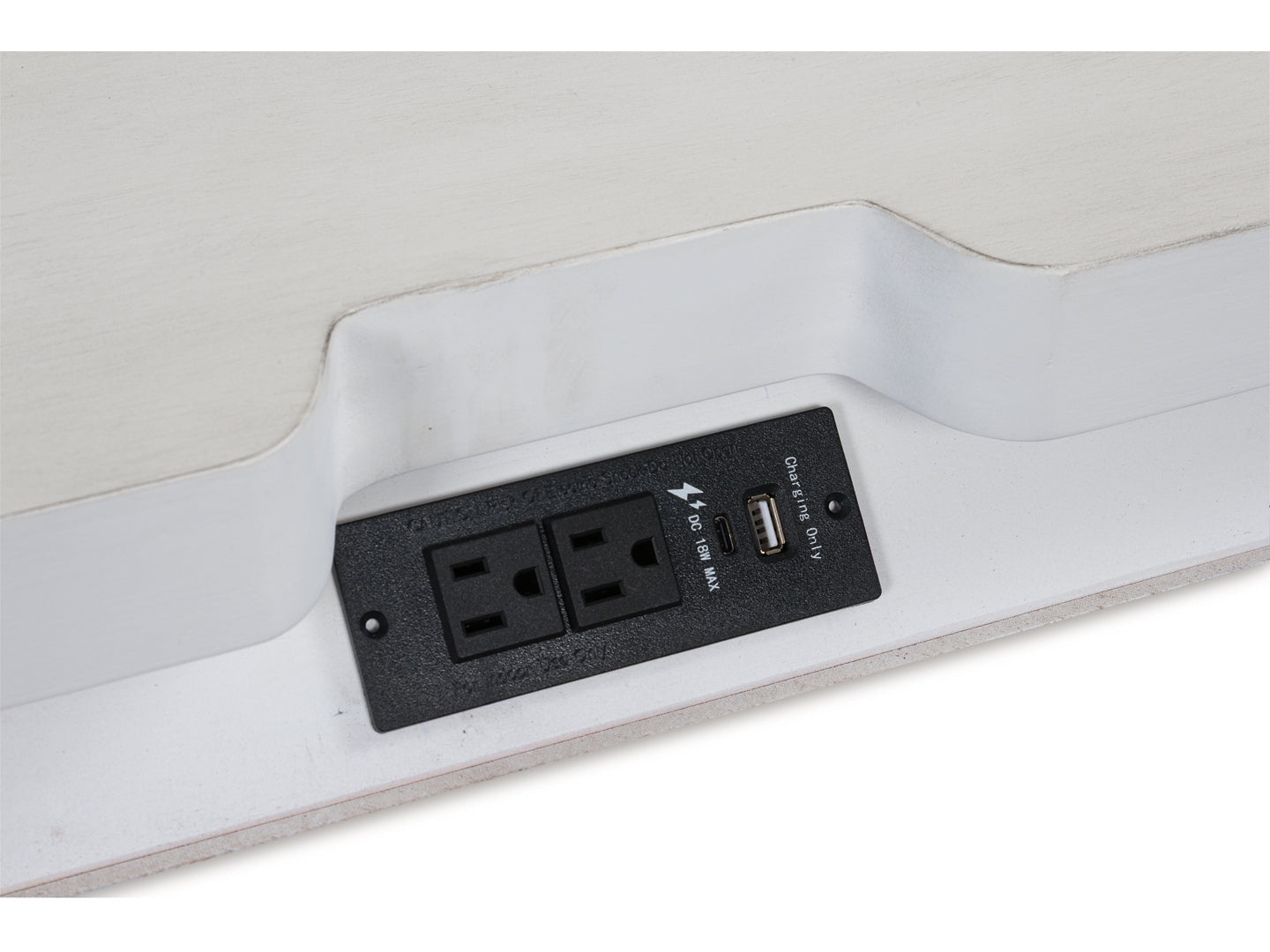 Détails | Fabriqué avec des bois durs massifs, des placages et des substrats MDF, finition blanche vieillie frottée, quincaillerie en métal avec finition ton étain, 3 tiroirs coulissants en douceur avec intérieurs entièrement finis, construction à queue d'aronde française/anglaise et glissières latérales à roulement à billes robustes, tiroir supérieur doublé de feutre, alimentation 110 V avec ports de charge USB-A et USB-C, cordon d'alimentation inclus ; homologué UL | |